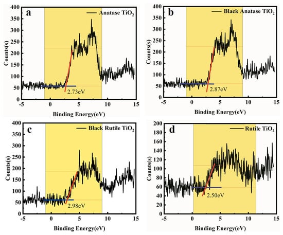 Shown in Figure 4 are the UPS spectra of anatase TiO2 and rutile TiO2 before and after laser treatment. Both results indicate that the top of the valence band of black TiO2 is lower than that of pristine TiO2, which is consistent with previous reports [14,15,18]. From the UV–vis absorption spectra (Figure 5a) and diffuse reflectance spectra (Figure S2b in the Supplementary Materials) of the six samples it can be seen that the main absorption of the six samples occurs in the spectral range of less than 400 nm, mainly due to the inherent bandgap of TiO2 (3.02–3.20 eV) [34]. It should be emphasized that the change in the absorption up to 2500 nm can also be observed (see Figure S2a in the Supplementary Materials), which indicates the strong effect of the laser treatment on the optical properties of TiO2.