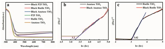 (a) The UV–vis absorption spectra of six samples of P25 TiO2, rutile TiO2, anatase TiO2, black P25 TiO2, black rutile TiO2, and black anatase TiO2; (b) Plots of (Ahν)2 vs. photon energy of anatase TiO2 and black anatase TiO2; (c) Plots of (Ahν)2 vs. photon energy of rutile TiO2 and black rutile TiO2. The blue lines are the fits to be tangent to the experimental curves.