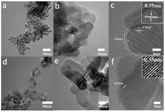 (a–c) are TEM and HRETM images of black P25 TiO2; (d–f) are TEM and HRETM images of P25 TiO2 without laser treatment. Insets in (c,f): Zoomed-in views for the TEM images.