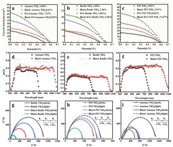 (a–c) are J–V curves of QDSSCs based on anatase TiO2, rutile TiO2, and P25 TiO2 photoanodes with and without laser treatment, respectively; (d–f) are IPCE curves of QDSSCs based on anatase TiO2, rutile TiO2, and P25 TiO2 photoanodes with and without laser treatment, respectively; (g–i) are Nyquist curves of anatase TiO2, rutile TiO2, and P25 TiO2 photoanodes with and without laser treatment measured in the dark and under illumination, respectively.