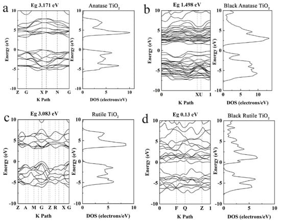 Energy band and density of states diagram based on first-principle calculation for (a) anatase TiO2, (b) black anatase TiO2 rich in oxygen vacancies, (c) rutile TiO2, and (d) black rutile TiO2 rich in oxygen vacancies.