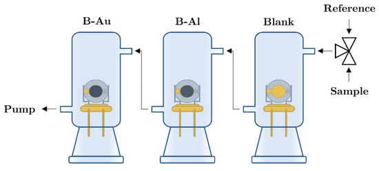 Blank and deposited QCM sensors with black gold (B-Al) and black aluminum (B-Al) films were characterized by an Agilent 4294A precision impedance analyser, 40 Hz–110 MHz (Keysight Technologies, Inc., Santa Rosa, CA, USA). Impedance spectra were measured around the fundamental resonance frequency of the QCMs at room temperature and in a constant gas flow of of synthetic air. A homemade 4-wire probe adapter and glass chamber were used for the measurement. From the obtained spectra, the parameters of the equivalent circuit, resonance frequencies, and quality factor were determined using an internal fitting algorithm of the impedance analyzer.