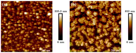 AFM pictures are shown in Figure 4. The B-Al surface is presented in Figure 4a, and the B-Au surface is shown in Figure 4b. RMS values of and are measured from the surface roughnesses of B-Al and B-Au films, respectively. The RMS value for B-Al is lower than those reported in our previous works, which were equal to and , respectively [11,12]. The mean difference between each result is the thickness of B-Al layers deposited previously of and , which are higher than the one deposited on the QCM sensors of 280 nm. An increase in the roughness value can be correlated with an increase in the B-Al film thickness.