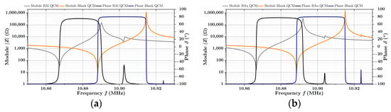 The impedance spectra of the QCM sensors before and after the deposition of the B-Al layer and the B-Au layer are presented in Figure 5a,b. Parameters of the commonly used Butterworth–Van Dyke (BVD) equivalent circuit, modeled by the impedance analyzer, were used for the QCM characterization. They are presented in Table 2 and Table 3. Since we are operating QCMs under atmospheric conditions, the BVD model is sufficient for the characterization of prepared QCM sensors, and its parameters well describe the behavior of the resonator. According to the literature, the motional resistance of equivalent circuit matches the dissipation of the oscillation energy with the influence of the surrounding environment, which is in contact with the crystal. The capacity corresponds to the energy stored in the oscillation and is related to the elasticity of quartz and surrounding spaces, while the inductance , in turn, corresponds to the mass loading adsorbed on the surface during the vibrations. The capacity is determined primarily by the capacitor, formed by the gold electrodes on both sides of a QCM, and depends mainly on its geometry [38].