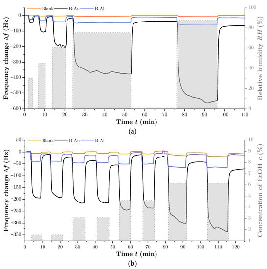 To investigate the sensing properties of prepared black metal layers and to determine the effect of highly nanostructured surfaces, the frequency response of prepared QCM sensors was simultaneously measured with the blank QCM, serving as a reference, to different concentrations of EtOH and water vapors. Figure 6a depicts the response to water vapors in terms of different relative humidity, while Figure 6b depicts the response to different concentrations of EtOH vapors. It can be clearly seen that the black metal coatings increased the response of the QCM sensors compared to the reference blank in both cases.
