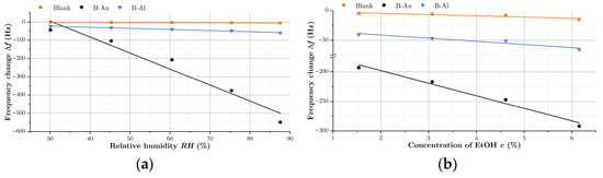 Response of QCM sensors with and without BMs coatings as a function of the concentration of H2O vapor in (a) and as a function of the concentration of EtOH vapor in (b).