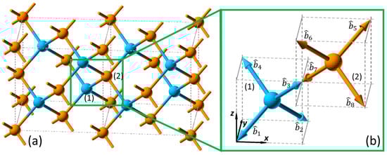 In the bond structure of Si(100) in the diamond structure shown in Figure 2a, the corresponding bond vectors can be determined as the unit vectors along the direction from the central atoms to the four bonding atoms. With the central atom at Position (1), the four bond vectors can be found as follows: