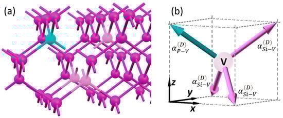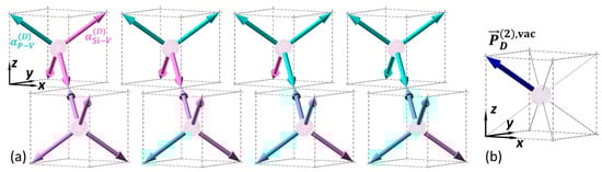 is assigned to the vector that corresponds to the PV bond. Four examples of the vacancy cells satisfying this condition are illustrated in Figure 4a, where the pink and cyan arrows correspond to the Si-V and P-V bonds, respectively. As shown in Figure 4b, the net dipolar SHG polarization of each vacancy cell pair shown in Figure 4a is along the bond vector (defined in Equation (8)). The fitted value indicates the density of such PnV clusters in the Si thin film.