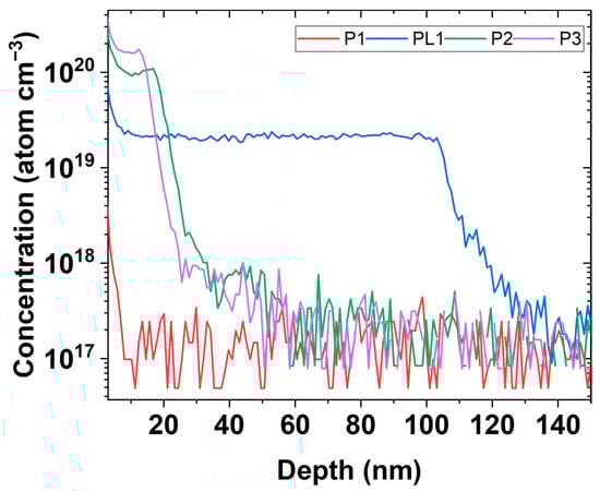 Samples of DSUTFs were grown on a Si(100) substrate via chemical vapor deposition (CVD). P1, P2, and P3 denote samples with a thickness of 20 nm and P concentrations of approximately , , and atoms/cm3, respectively. Besides, a P-doped Si ultrathin film thickness of 100 nm and a P concentration of atoms/cm3, named PL1, were provided for further comparison and study. The actual dopant concentration and thickness of these samples were measured via secondary ion mass spectroscopy (SIMS) at the National Synchrotron Radiation Research Center in Taiwan (Figure 5). The lower limit of the measurable P concentration with this SIMS is determined to be atoms/cm3 by the mean value measured at a depth of z > 100 nm in the samples P2 and P3.
