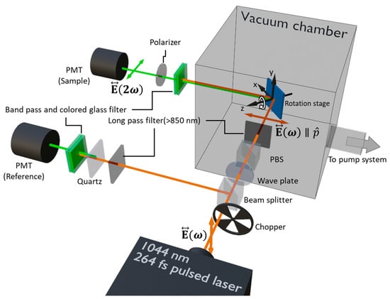 The RSHG signal was generated from the DSUTF while the p-polarized fundamental beam irradiated on the DSUTF. After exiting the vacuum chamber, the RSHG beam passed through a filter set and a p-polarizer before entering the photomultiplier tube (denoted PMT (Sample) in Figure 6) (R1527P; Hamamatsu Photonics, Shizuoka, Japan), which recorded the pp-polarized RSHG signal. The filter set was composed of a bandpass filter and a colored glass filter (colored Glass FBG 39; Thorlabs, Newton, NJ, USA, and bandpass filter 520 nm; Edmond, OK, USA).