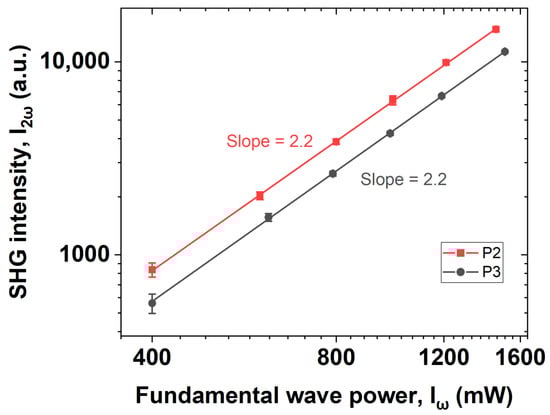 First, we examined the SHG phenomenon by observing the power law dependency on two samples. Figure 7 shows the second-order dependence of the doubled-frequency signal intensity on the power of the fundamental wave, which confirms the nonlinear nature of the SHG mechanism.