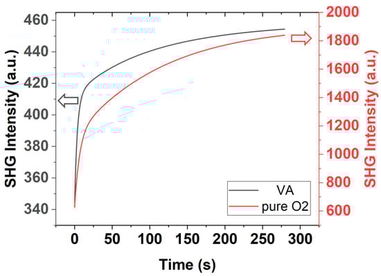 Time-dependent SHG of P1 in a vacuum (left y-axis scale) and pure O2 gas (right y-axis scale).