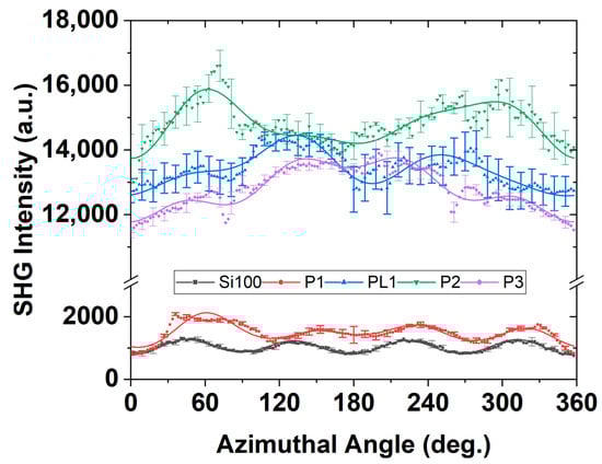 The Ani-RSHG spectra and the analyzed coefficients for Samples P1~P3 with the reference of the Si(100) substrate are shown in Figure 9 and Figure 10, respectively.