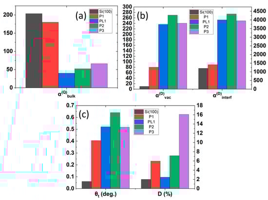 As described in Section 2.2, changes in indicate the uniformity of the lattice structure. In Figure 10a, the value is reduced as the P concentration increases, suggesting that the addition of P degrades the crystalline order of the Si lattice. Following the discussion in Section 2.4, intuitively responds to the density of the PnV cluster in a positive correlation. As shown in Figure 10b, the increases with the doping concentration. Similar behavior is also observed in the effective lattice tilt angle, , shown in Figure 10b, indicating an increasing degree of misorientation of the lattices caused by the increase of the incorporated P dopant. Whether one considers the precipitation of the dopants toward the SiO2/Si interface or simply the percentage of P concentration as the probability of the P atoms appearing in the substitutional Si sites at the interface, it is expected that the change in the doping concentration affects the net dipolar SHG contribution from the SiO2/Si interface, which can be observed on the in Figure 10b. In the trends of the , , and (in Figure 10c) with an increasing concentration, P3 is demonstrated to be a common exception. Considering the lattice mismatch of 9.0% between the Si and P [40,41], the unrealistically high value of the deformation ratio, D, of P3 shown in Figure 10c suggests an explanation for this reverse trend, i.e., that the lattice structure severely deviates from the Si(100) matrix, such that the proposed dopant–vacancy model is no longer sufficient to predict the Ani-RSHG spectrum.