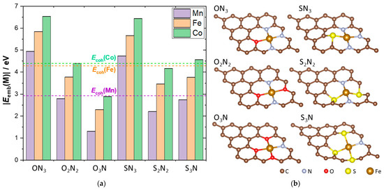 The embedding energies of M@XxNyG are shown graphically in Figure 1a. In order to evaluate the stability of the M single atoms in XxNyG, we compared these energies with the cohesive energies of the corresponding metals, Ecoh(M). Co was found to be stable in all of the investigated XxNy-centers. For ON3 and SN3 mixed centers, Eemb(M) surpassed Ecoh(M) for all three metals, i.e., the metals were more stable in XxNyG than in the bulk metal lattice. However, that was not the case for Mn and Fe in other investigated mixed centers, where some metal aggregation was possible. We noticed that for one XxNyG center, the embedding energies followed the general trend |Eemb(Co)| > |Eemb(Fe)| > |Eemb(Mn)|. The calculated |Eemb(M)| values were generally lower than those of N4-graphene [23]. The higher O content in OxNy was found to have a weakening effect on Eemb(M@OxNyG). Finally, we noted that for the X2N2 coordination environments, there were two symmetrically different possibilities. The possibility considered here (Figure 1b) was formally represented as ONON (SNSN), going clockwise. In the cases of both O and S, this configuration was energetically more stable than ONNO (SNNS, going clockwise again), by 0.461 eV in the case of the O2N2 environment and 1.835 eV in the case of the S2N2 environment. Thus, only the X2N2 arrangement presented in Figure 1b was studied here.