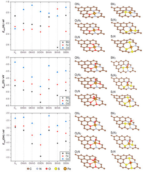 Next, we investigated the adsorption of H, O, and OH onto the M@XxNyG systems shown above at the M-top adsorption site (directly above the metal atom). First, let us focus on the adsorption of atomic hydrogen. The strongest H binding was found in the case of H@Mn@S2N2G, with Eads(H) amounting to −2.65 eV. For nearly all of the investigated systems, we found that for the same XxNy center, Eads(H@M@XxNyG) followed the trend |Eads(H@Fe@XxNyG)| > |Eads(H@Mn@XxNyG)| > |Eads(H@Co@XxNyG)|. Thus, H adsorption was strongest when Fe was embedded in the given center and weakest when Co was embedded (Figure 2). The only exception from this trend was the S2N2 center, for which H binding was strongest when M was Mn and weakest when M was Fe. Comparing the studied systems with their N4-analogues, we found that Co embedded in the mixed center bound hydrogen more weakly than the N4-case, while for Mn and Fe, H binding could be stronger or weaker, depending on the nature of the chosen center.