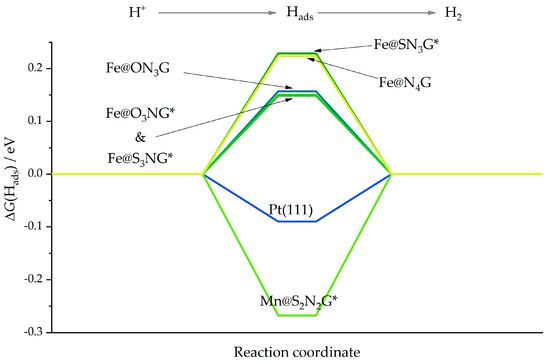 The presented systems with Fe centers showed that the formation of Hads required energy input. Thus, Hads will be formed at potentials below 0 vs. RHE. However, compared to the well-known Fe@N4G system, activity improvements were expected for Fe@ON3G, Fe@O3NG, and Fe@S3NG, while Fe@SN3G should display very similar HER activity as Fe@N4G. Nevertheless, based on the potentials presented in Table 2, the Fe@O3NG and Fe@S3NG systems should not be stable at 0 V vs. RHE. Thus, the metal center would dissolve in highly acidic media, which corresponded to the considered HER conditions. Moreover, going back to Figure 1, one can see that for the Fe@O3NG and Fe@S3NG systems, Eemb(Fe) was also below the Fe cohesive energy. This not only means that the metal centers could dissolve under HER conditions, but also that some Fe aggregation could be expected during the synthesis of such SACs. This observation reinforced the conclusion that active center stability must be considered before assessing activity.