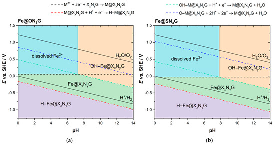 In addition to stability, one should also consider the speciation of the SAC active center under different reaction conditions. Thus, we finally constructed surface Pourbaix diagrams, allowing us to easily determine which phase was the most stable for a given E and pH. We chose two systems, Fe@ON3G and Fe@SN3G (Figure 4), which should have been relatively stable in a wide range of pH values and electrode potentials, based on the data presented in Table 2. In fact, Co and Fe at the ON3 and SN3 centers were found to be the only stable metal atoms at pH = 0 among all the studied cases. The Fe center was previously found to be stable at the N4-center in graphene for all pH values [23]. We found that in the case of the mixed XxNy centers, dissolution was possible, but we also found regions where Fe@XxNyG was stable and where adsorbed H or OH were stable.