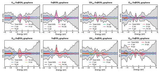 Considering the results presented in Figure 4, one can see that both systems could easily dissolve at potentials close to 0 V vs. RHE (please note that the Nernst potential for dissolution was calculated from the standard potentials and assuming an Fe concentration (activity) of 10−8 mol dm−3, which shifts the equilibrium potential to lower values). At pH values above 8, both systems tended to adsorb OH rather than getting dissolved. However, this also meant that under oxygen reduction reaction conditions, both centers should bind OHads and the reaction was likely to proceed at the active site, which was not bare as in a vacuum. Therefore, natural questions arise regarding the stability and activity of such modified active centers. Such questions were recently tackled by Nematollahi et al. [12], showing that in the case of Fe-N4 centers, a fifth ligand such as −NH2, −OH, and −SO4 can improve stability and direct the oxygen reduction reaction towards the selective 4e reduction pathway. This means that it is necessary to consider other possible adsorbates that can tune the active center’s electronic structure, stability, and reactivity. However, it is more than obvious that the electronic structure of the active center is particularly affected by the presence of different adsorbates (Figure 5). At first glance, for the Fe@ON3G and Fe@SN3G systems, it seemed that the electronic structures of the bare metal centers were mutually similar and mainly determined by nitrogen ligands. The same held true for centers with Hads. However, the situation differed for Fe centers with OHads and Oads, which was reflected in somewhat different oxidation potentials, particularly for cases of Oads-Fe.