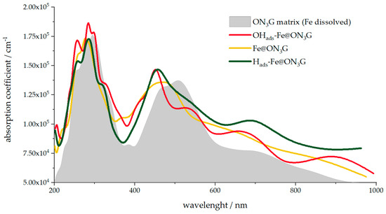 As mentioned, there is direct experimental evidence that SAC active centers might differ from their “pristine” forms under operating conditions. For example, using in operando XANES and FT-EXAFS [11], it was shown that under oxygen reduction reaction conditions, OHads formed at the Fe-N4 center. As we previously discussed [23], synchrotron-based techniques are not widely available, particularly in situ and in operando. However, less sophisticated techniques may be sufficient to show that the active center has changed under potential cycling or due to the pH of the environment, or at least demonstrate qualitative changes. We previously suggested in situ FTIR as a possible option, where the characteristic bands could be used to confirm the formation of some adsorbate species at the metal center or carbon matrix [23]. On the other hand, Figure 5 clearly demonstrates that the electronic structure of the SAC near the Fermi level changed upon adsorption of different species. Thus, one might expect that the optical properties of SACs would also change in the case of potential modulation or pH change, leading to the dissolution of metals or adsorption at metallic sites. Figure 6 shows the calculated UVC-Vis-NIR spectra (from 200 to 1000 nm) of bare Fe@ON3G systems with Hads, Oads, and OHads, but also of an empty ON3G moiety, corresponding to the situation when the Fe center is expected to dissolve (pH < 7 and potentials above 0 V vs. RHE, Figure 4). We noticed that the use of UV-Vis spectroscopy for the study of porphyrins is rather widespread and the technique is sensitive to the coordination of metal centers [39,40,41].