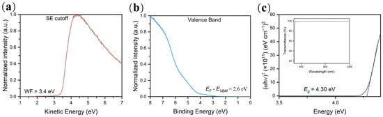 (a) UPS measurement results of the secondary electron cutoff spectrum and (b) the valence band spectrum of the TX-100 thin film; (c) plot of (αhν)2 against photon energy for the TX-100 film, the transmittance from 180 to 1200 nm is shown in the inset.