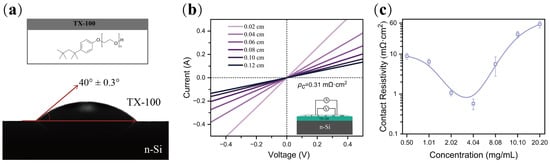 (a) Contact angle of TX-100 solution on HF-treated n-Si surface. The inset shows the chemical formula of TX-100; (b) I-V curves and calculated contact resistivity for the n-Si (1−3 Ω·cm)/TX-100 (4.04 mg/mL)/Al structure. The inset shows the TLM test structure; (c) relation between the ρc value and concentration for TX-100/Al contact.