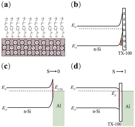 The improved carrier selectivity with organic solvents was often explained by surface charge accumulation, which came from ionic or strong polar groups such as amino and hydroxyl groups, fluorine-containing groups, etc. [40,41]. The schematic diagram of this statement is shown in Figure 3a. However, it is difficult to prove that most molecules are regularly arranged on the interface to form a high facial density, especially when these organic molecules are covered with thick metal electrodes (for example Al). Although TX-100 is a neutral surfactant, it does not ionize in water to produce charged ions, the silicon surface treated with HF solution is hydrophobic, thus it is reasonable to assume that the alkyl group of TX-100 stays close to the c-Si surface while the ether group tends to be far away from the surface (Figure 3a). However, as we know, the alkyl group is nearly neutral and the ether group is relatively negatively charged due to its strong electronegativity. It means the outer surface of c-Si has some negative charges. According to the principle of electrical neutrality, the energy band of c-Si should bend upward to accumulate positive charges (holes) (Figure 3b). Obviously, this inference is in contradiction with the experimental results (electron selectivity). Accordingly, we believe that ionization or spontaneously ordered charge accumulation originating from organic molecules cannot provide a convincing explanation for electron selectivity.