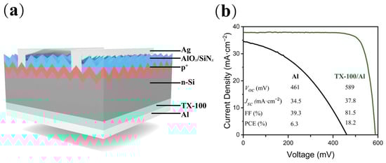 (a) Schematic of an n-type silicon solar cell with full-area TX-100/Al contact on the backside; (b) illuminated J−V curves without and with TX-100.