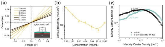 (a) I-V curves and calculated contact resistivity and test structure for the n-Si (1−3 Ω·cm)/a-Si:H(i)/TX-100 (10.10 mg/mL)/Al contact; (b) contact resistivity for different TX-100 concentration in n-Si/a-Si:H(i)/TX-100/Al contact; (c) passivation properties for double sides passivated n-Si wafers without and with TX-100.
