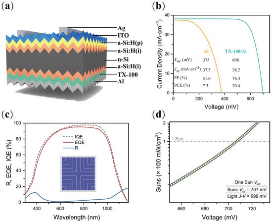 (a) Schematic of an n-type silicon solar cell with full-area a-Si:H(i)/TX-100/Al contact on the backside; (b) illuminated J−V curves of heterojunction solar cells without and with TX-100; (c) the reflectance and external/internal quantum efficiencies and (d) Voc of the solar cell with TX-100.