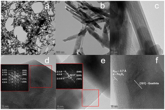 | α-FeOOH (a), α-Fe2O3 (b), Fe3O4 (c) nanorods | (a) α-FeOOH phase (b) α-Fe2O3 phase (c) Fe3O4 phase | – | – | (a) D = 70 nm L = 500 nm (b) D = 70 nm L = 120–200 nm (c) D = 70 nm L = 500 nm | Particles size is not discussed (a) [(110) plane, d = 0.42 nm] (b) [(012) plane, d = 0.368 nm; (110) plane, d = 0.251 nm] (c) [(311) plane, d = 0.25 nm; (400) plane, d = 0.2 nm] | – | [70] |