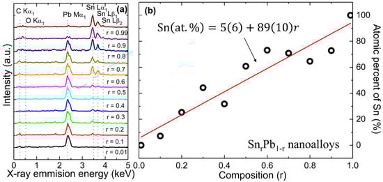 (a) Typical EDS elemental spectra reveal a series of peaks associated with Sn and Pb elements, verifying that the SnrPb1-r bimetallic nanoalloys contain only Sn and Pb elements; (b) atomic % of Sn with respect to the initial composition of SnrPb1-r bimetallic nanoalloys.