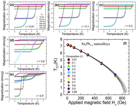 Sn and Pb are weak- and strong-coupled type-I superconductors, respectively. Therefore, studying the low-temperature properties of Sn-Pb bimetallic nanoalloys will give further insight into the effect of alloying on the SC properties [17]. Furthermore, if the grain size of randomly distributed Sn and Pb in the immiscible bimetallic nanoalloys is smaller than their respective coherence length, it can further alter the SC properties due to SPE. Therefore, we have applied magnetic field and temperature-dependent magnetization measurements to study the SC properties using a magnetometer (Quantum Design MPMS VSM SQUID). A temperature dependence series of magnetization measurements between T = 2 to 8 K using an applied magnetic field of Ha = 100 Oe in the ZFC and FC modes for r = 0.01, 0.7, 0.8, 0.9, and 0.99 SnPb nanoalloys are shown in Figure 4a–e, where r = 0.1~0.6 are shown in Figure S2 (Supporting Information). The observed step-like behavior of M(T) curves for r = 0.01 indicates that magnetic flux cannot penetrate the materials in a small external field of 100 Oe. However, with an increased Sn concentration, the broadening of M(T) was observed, which could be because of the inhomogeneous distribution of Pb in the Sn matrix. Interestingly, a one-step-like transition was observed from nanoalloys with initial composition r = 0.01–0.7. However, nanoalloys with r ≥ 0.8 show two-step-like transitions. The M(T) curves can be described effectively using a modified London equation with free fitting parameter p, assuming that alloying of Sn and Pb resulted in the formation of SC grains of size <d> obtained from the EDS mapped image of SnrPb1-r nanoalloys [18,19]. The analysis of mean granular size <d> of segregated Sn (bright green color) and Pb (red color) elements obtained from the EDS mapping results are tabulated in Table 2. From the modified London equation, the DC magnetization can be written as: