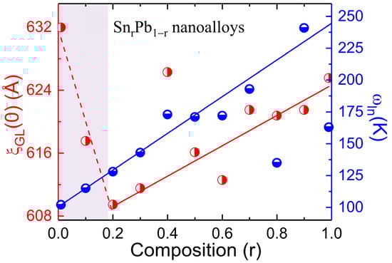 According to Pippard, Cooper pair size manifests as a superconducting energy gap ∆(0), which becomes shorter with increased coupling strength [36]. On the other hand, phonon-mediated superconductors subversion of coupling strength was observed due to the phonon hardening effect. Therefore, the estimated values of GL coherence length ξGL(0) and the average logarithmic phonon energy ωln are linked with the coupling strength of the superconductor. Figure 9 depicts the initial composition r dependence of calculated values of ξGL(0) and ωln from SnrPb1-r (0.01 ≤ r ≤ 0.99) bimetallic nanoalloys. For an initial Sn concentration from r = 0.01 to 0.2, a steep drop behavior of ξGL(0) was observed (the dashed red line is guided for the eyes), while the two elements of Pb and Sn form a solid solution of the α-Pb phase. The resultant phase diagram is thus completely different from those of other composition regions r = 0.2~0.99, typical immiscible bimetallic superconductors of Sn and Pb compounds, in which ξGL(0) and ωln increase when Sn is substituted for Pb in the strong-coupled superconducting “parent” compounds. Notably, the solid solutions in the superconducting range exhibit ξGL(0) anomalies at r = 0.01–0.1. The behavior is reminiscent of the disorder, and substitution in weak coupling superconductivity could enhance the electron–phonon coupling constant. A simplified physical model of electron–phonon coupling has been developed by Gao et al. to allow heat transfer from phonons to electrons and applied to study defects or disorders as a function of the strength of electron–phonon coupling [37]. The number of point defects produced in the primary damage state increases with the strength of electron–phonon coupling, signaling that the defect or disorder/substitution plays a role in the increasing strength of the electron–phonon coupling constant. A maximum of λep = 1.046 from r = 0.01 and λep = 0.97 from r = 0.1 (as shown in Table 3) indicates that the similarity suggests the enhancement of the electron–phonon coupling in the present case also has a substitutional origin. On the other hand, ωln shows a linear increasing behavior (the solid blue line is guided for eyes) with the decrease of coupling strength from r = 0.01 to 0.9, above which fluctuations were observed. The observed results agree with theoretical findings except for the high Pb concentration (r = 0.01 and 0.1) region.