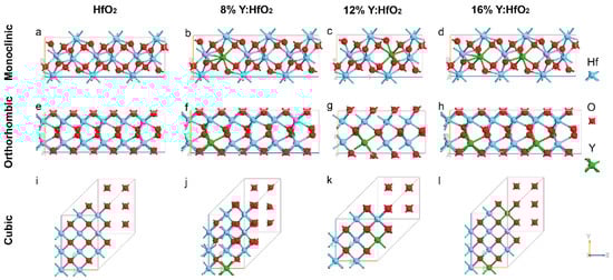 Schematic representation of all the examined systems. Monoclinic P21/c (a) HfO2, (b) 8% Y:HfO2, (c) 12% Y:HfO2, and (d) 16% Y:HfO2; Orthorhombic Pca21 (e) HfO2, (f) 8% Y:HfO2, (g) 12% Y:HfO2, and (h) 16% Y:HfO2; Cubic Fmm (i) HfO2, (j) 8% Y:HfO2, (k) 12% Y:HfO2, and (l) 16% Y:HfO2. Color code in the ball and stick model: Y green, Hf blue and O red.