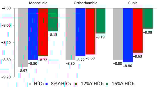 As reported by other studies [22,23], a doping concentration of about 8% of Y brings a stabilization of the cubic phase in HfO2. In our case, moving to a higher concentration of Y-dopant than the minimum value required to stabilize the cubic polymorph affects the geometry and the energy of the structures, and as a consequence, the results obtained for the 12% and 16% of Y doping are not so accurate as those obtained for the 8% of Y.