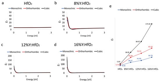 Real part of the dielectric constant. εr of monoclinic P21/c (blue curve), orthorhombic Pca21 (red curve), and cubic Fmm (black curve) polymorphs evaluated between 0 and 3 eV of HfO2 (a), 8% Y:HfO2 (b), 12% Y:HfO2 (c), and 16% Y:HfO2 (d). The schematic trend of εr at 0 eV as a function of the crystalline phase and Y content (e).