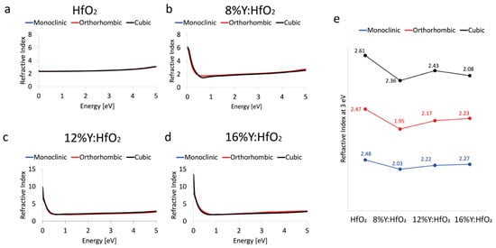 Refractive Index. Refractive index of monoclinic P21/c (blue curve), orthorhombic Pca21 (red curve), and cubic Fmm (black curve) polymorphs evaluated between 0 and 5 eV of HfO2 (a), 8% Y:HfO2 (b), 12% Y:HfO2 (c), and 16% Y:HfO2 (d). Schematic trend of n at 3 eV as a function of the crystalline phase and Y content (e).