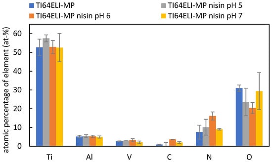 The EDS analysis of the bare and nisin-functionalized samples (Figure 2) evidences the presence of all the elements characteristic of the surface of the titanium alloy: Ti, Al, V, and O. A slight increase in nitrogen (N) is noticed comparing the bare and functionalized surfaces, suggesting the presence of the nisin polypeptide on the sample surface; this enhancement is much more significant for the sample functionalized at pH 6, where an increase in carbon (C) is also detectable. Considering the high penetration depth of EDS (higher than 1 micron) and the expected low thickness of the functionalized surface layer, the high standard deviation obtained by this analysis is not surprising. The surface chemical analysis was confirmed through XPS quantitative analysis, which is much more suitable for the chemical characterization of the outermost surface layer thanks to its nanoscale sampling depth, which makes it a more sensitive surface analysis technique [38].