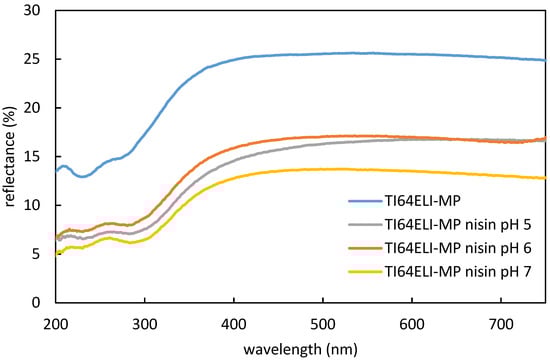 Reflectance measurement was performed for both bare and nisin-functionalized samples by means of a UV–Vis spectrophotometer (UV-2600 Shimadzu, Kyoto, Japan, equipped with ISR-2600Plus integration sphere). The spectrum of 190–750 nm was evaluated in the measurements.