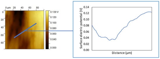 In addition, KPFM has been used for imaging the functionalized surface. A sample functionalized at pH 6 has been chosen for this experiment due to its highest amount of the adsorbed nisin evidenced by EDS and XPS measurements. An internal control surface is needed for this analysis. For this purpose, a sample functionalized only on the half surface and with a sharp border between the functionalized and un-functionalized area has been prepared. When comparing the bare (lighter area) and functionalized (darker) areas of this sample, a clear difference in the surface electrical potential is detected across the interface (Figure 4). This is a further confirmation of the presence of the functionalized surface layer. No evident formation of nisin micrometric aggregates on the surface can be evidenced while the covering seems not homogeneous.