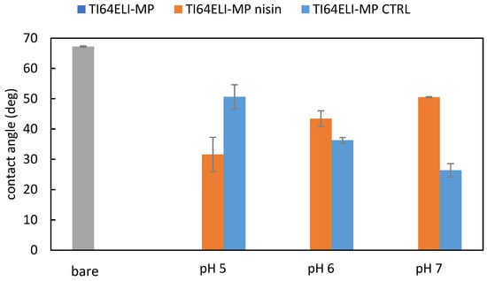 It must be considered an eventual contribution due to a modification of the titanium oxide layer during the soaking in solutions at different pH, regardless of the presence of nisin. This effect has been taken into account by considering some control samples soaked, at any pH value, in analogous solutions without nisin (TI64MP-CTRL, blue bars in Figure 4). As displayed in Figure 5, the contact angle of the control samples decreases by increasing the pH of the solution. The opposite phenomenon is observed for the samples functionalized with nisin. At first, these data confirm the presence of nisin on the functionalized samples because of a different wettability than the bare and the control ones. Overall, all the functionalized samples are more hydrophilic than the bare substrate MP, with a maximum difference for the sample functionalized at pH 5. In this case, the presence of nisin induces an increase in wettability even larger than the relative control. A conformation of the adsorbed nisin exposing the hydrophilic moieties outwards is then hypothesized. Contrarily, the presence of nisin on the surface of the samples functionalized at pH 6 and 7 induces a lower wettability with respect to the control samples: a conformation of the adsorbed nisin exposing the hydrophobic moieties outwards can be supposed in these cases. Considering that the hydrophobic tail is the active antibacterial functionality of nisin [39], it can be speculated that this process is much more effective for antimicrobial applications.