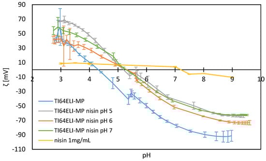 Zeta potential titration curves of the bare MP sample, surfaces functionalized with processes at different pH values, and a solution of nisin.