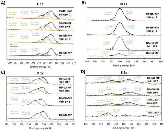 Concerning the profile fitting of the S region (Figure 8D), a contribution of the thioether bridges -C-S-C- coming from the nisin backbone is observable on the functionalized samples. Regarding S high-resolution XPS data, each chemical state corresponds to a double of peaks, in the case of C-S-C (163 eV and 164 eV) [41]. The other detected S state, with the peak doublet approximately at 168 eV and 169 eV, could be due to the contribution of sulphonate groups (C-SO3-H). However, as shown in the XPS survey scan (Table 1), no sound conclusion about the S contribution can be made due to the low detected amount similar to control samples without nisin.