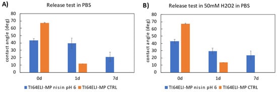 Once characterized by the functionalized surfaces, two release tests have been performed to investigate the expected mechanism of action of the functionalized surface once in contact with a liquid environment chemically close to the physiological one. The samples functionalized at pH 6 have been used as an example, based on their expected high nisin content and the highest electrostatic difference between the substrate and the polypeptide, as discussed earlier. A control MP sample (without any functionalization layer) has been soaked in the same solution. The solution used for the first release test is PBS to mimic the physiological chemical environment. A second solution has been exploited to mimic an inflammatory chemical environment. It was obtained by adding hydrogen peroxide to PBS and reducing pH down to 4.5 [42]. The eventual change in the surfaces after the release tests has been monitored by the static contact angle measurements. The contact angle results of the release test are reported in Figure 9.