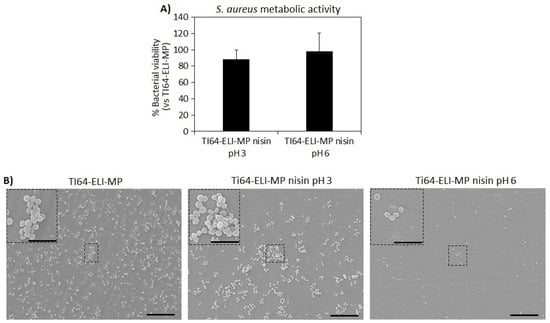 Antibacterial activity evaluation of Ti64ELI-MP functionalized with nisin at pH 3 and pH 6 after 24 h; (A) metabolic activity of bacterial cells normalized towards bare substrate Ti64ELI-MP; (B) SEM images at two magnifications: 2000× (scale bare = 10 µm) and 5000× (scale bar = 5 µm).