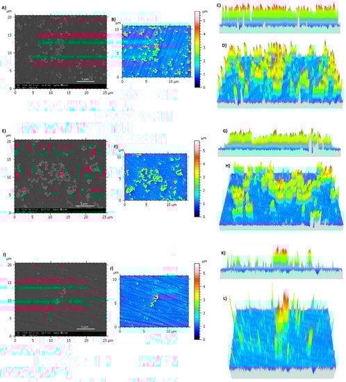 Three-dimensional reconstructed images of bacterial microcolonies on samples’ surfaces extracted from SEM images with SMILE VIEWTM software. Ti64ELI-MP: (A) SEM image at magnification 2000× (scale bar= 5 µm); (B) reconstructed 3D image extracted from (A); (C) cross-section image of the bacterial microcolonies on the sample surface; (D) whole view of bacterial microcolonies from the selected section; Ti64ELI-MP nisin pH 3: (E) SEM image at magnification 2000× (scale bar= 5 µm); (F) reconstructed 3D image extracted from (E); (G) cross-section of the bacterial microcolonies on the sample surface; (H) whole view of bacterial microcolonies from the selected section; Ti64ELI-MP nisin pH 6: (I) SEM image at magnification 2000× (scale bar= 5 µm); (J) reconstructed 3D image extracted from (I); (K) cross-section of the bacterial microcolonies on the sample surface; (L) whole view of bacterial microcolonies from the selected section. Bars indicate the height of microcolonies (µm).