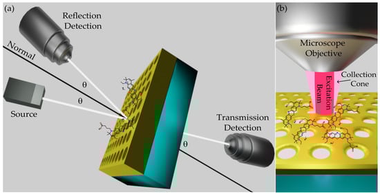 Measurement schemes. (a) Reflectance and transmittance outline. The R spectra were recorded in specular reflectance configuration, while the T spectra were collected by rotating the source and the detector by the same angle with respect to the normal incidence of the plasmonic metasurface. (b) Excitation and collection epifluorescence scheme for photoluminescence detection.