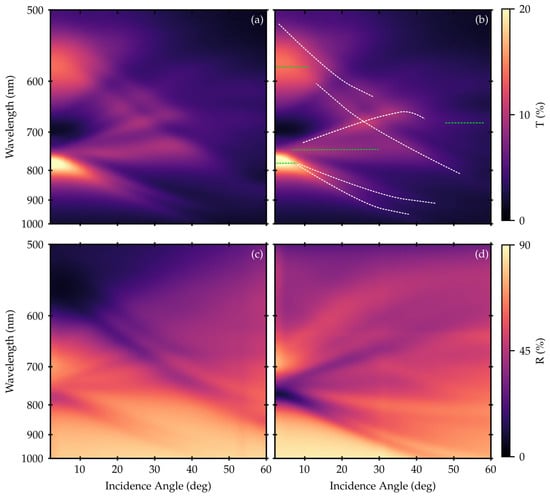 Reflectance and transmittance data are plotted in the form of an intensity map as a function of both the incidence angle and the wavelength in Figure 3.