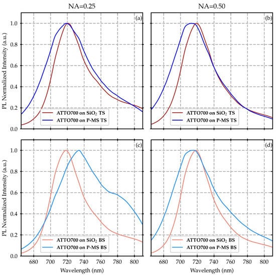 Normalized photoluminescence spectra of ATTO700 dye deposited on the top side of the plasmonic metasurface (P-MS) and the reference SiO2 slide. The first row refers to the excitation and collection from the FS for microscope objective numerical apertures of NA = 0.25 (a) and NA = 0.50 (b). Panels (c,d) refer to the excitation and collection from the BS for microscope objective numerical apertures of NA = 0.25 and NA = 0.50, respectively.